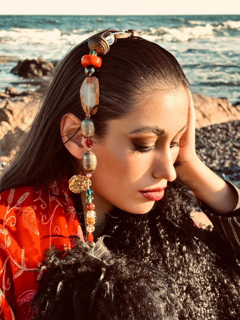 La diseñadora apuesta por telas nobles: lino, algodón rústico, mezclas artesanales y tejidos recuperados que evocan paisajes lejanos. Cada prenda lleva consigo relatos tejidos y colores terrosos que conversan con rojos vibrantes o azules profundos, mostrando un equilibrio entre tradición y vanguardia. Esa estética étnica no emula culturas ajenas, sino que reinterpreta las raíces ancestrales con originalidad y autenticidad.